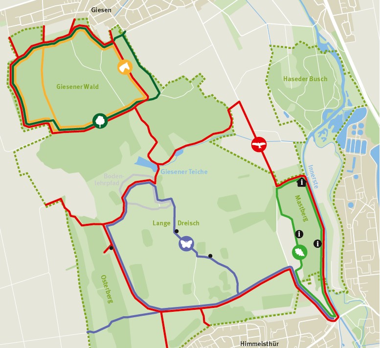 - Ausgangspunkt: Parkplatz am Ehrenmal in Giesen oder an der ehemaligen Panzerwaschanlage, weitere Startpunkte möglich